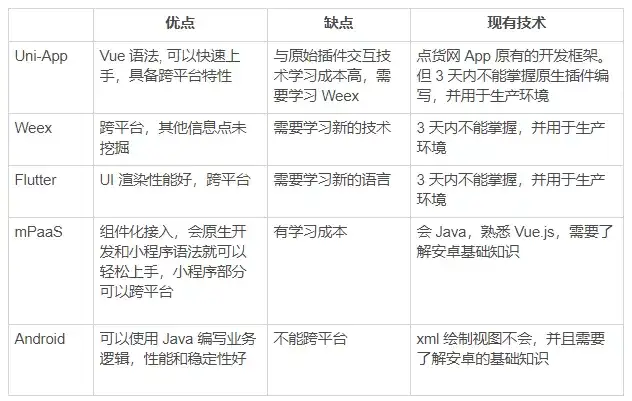 我们开始筛选市面上各类跨平台的 App 开发技术,在此期间对比了 Uni-App、Weex、Flutter、mPaaS 等跨平台开发框架。