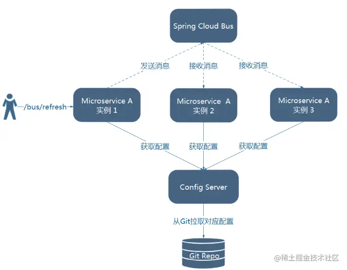 由图可知,微服务A的所有实例通过消息总线连接到了一起,每个实例都会订阅配置更新事件。当其中一个微服务节点的/bus/refresh端点被请求时,该实例就会向消息总线发送一个配置更新事件,其他实例获得该事件后也会更新配置。