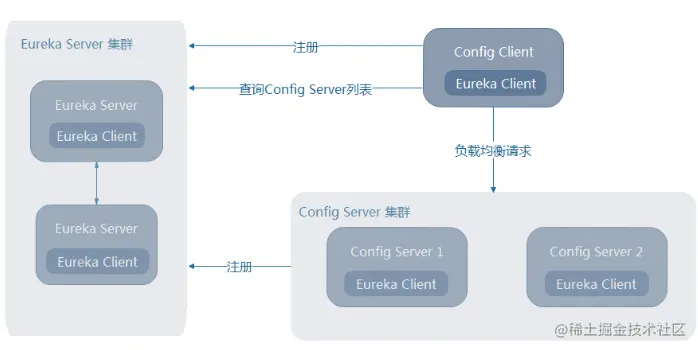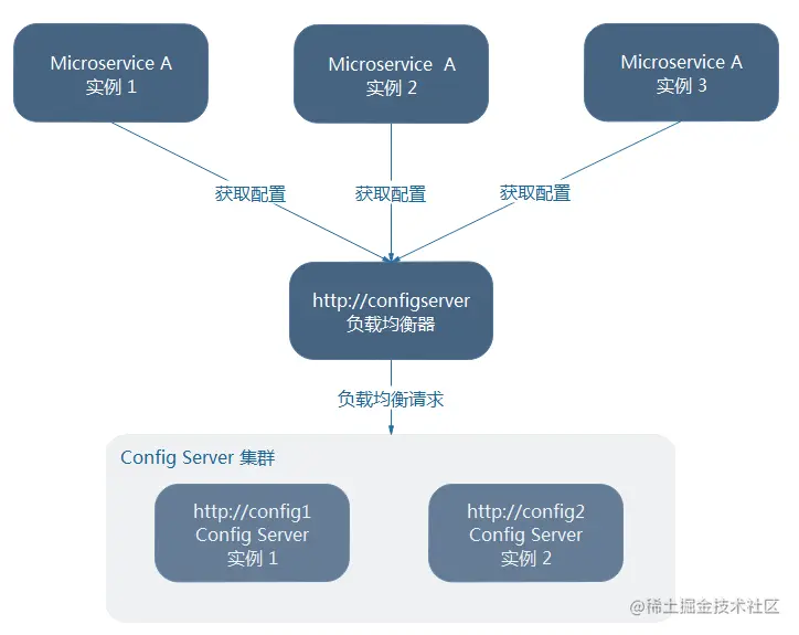 各个微服务将请求发送到负载均衡器,负载均衡器将请求转发到其代理的其中一个Config Server节点。这样,就可以实现Config Server的高可用。