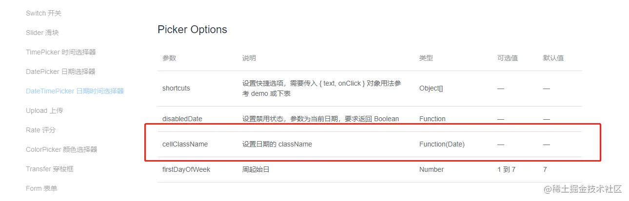 2. 在官方文档中找到发现可以自动以某日的样式的参数,找到picker-options