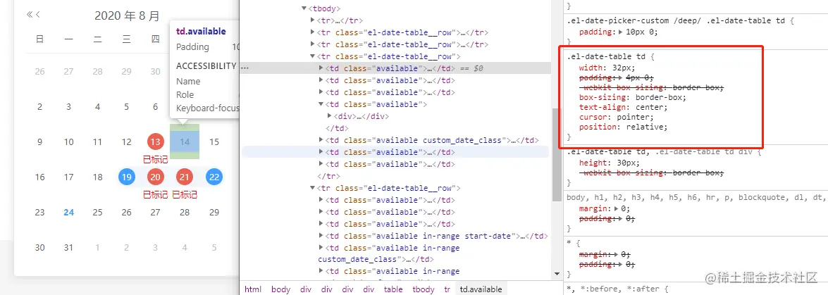 完成前4步,会出现上图的情况,选中日期时挡住了部分文字,再翻翻文档有什么可用参数,找到popper-class