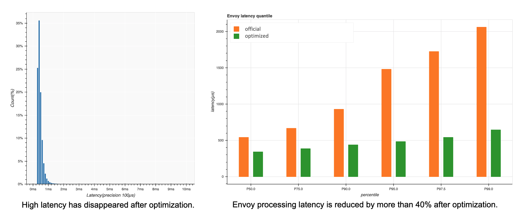 进行架构优化之后,我们也做了对比测试,上图左测是延时与消息数量图,可以看到它高延时部分得到明显的改善。上图右可以看出Envoy整体的延时降低了40%以上。