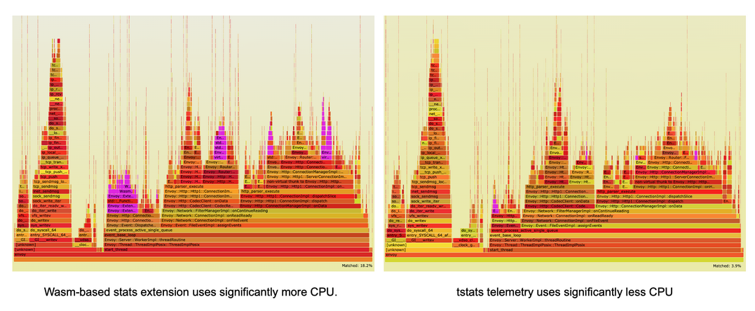 使用火焰图重新观察一下Envoy内部的CPU使用分布,我们发现tstats遥测插件占用CPU的比例明显更少,而使用wasm的遥测插件有一个明显的CPU占用来实现遥测,这也证明了tstats优化是有效果的。