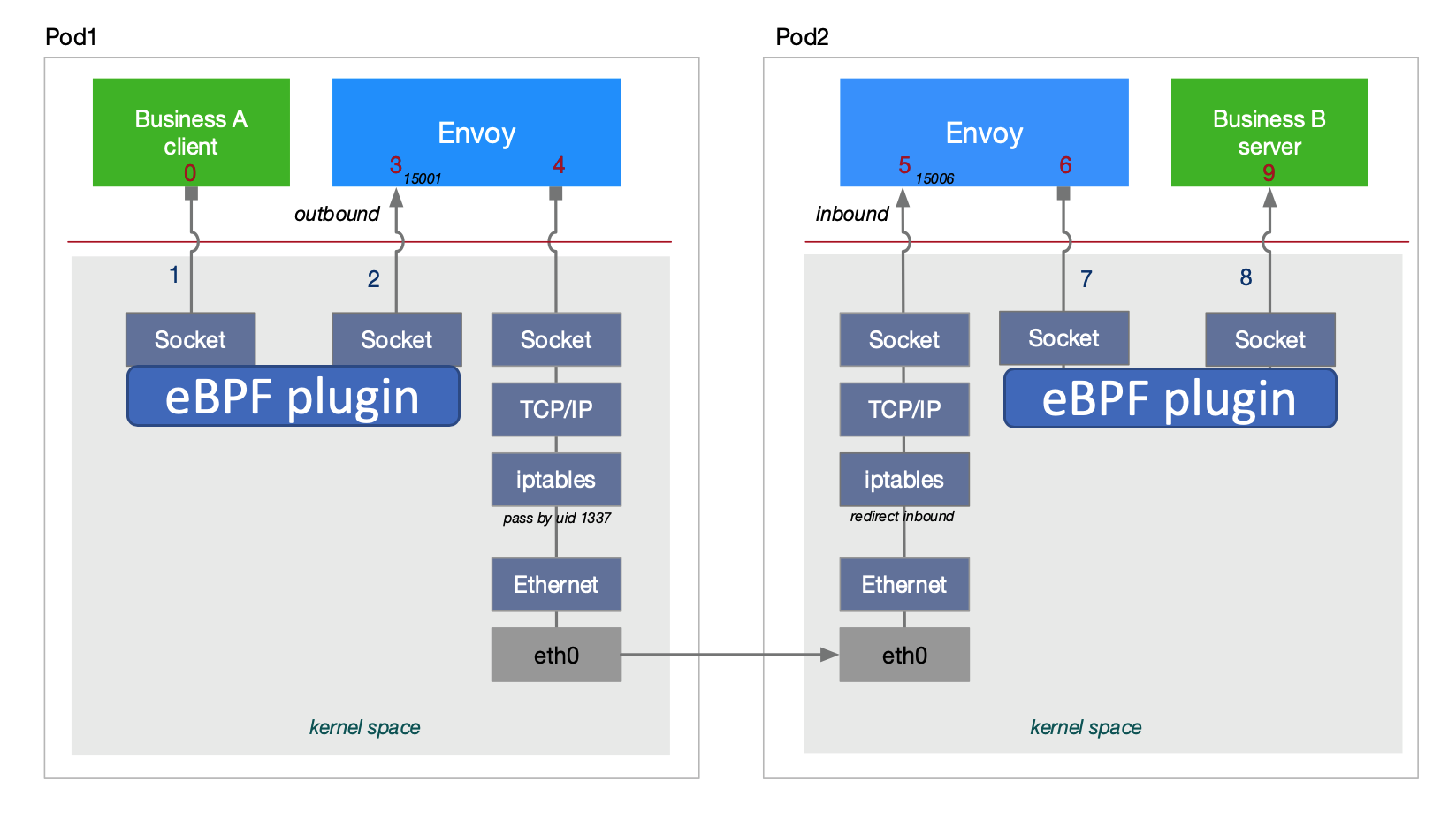- 使用XDP进行加速,因为由于istio proxy的引入,Pod和Pod之间的访问实际上是不需要经过主机上的iptables规则处理。基于这一点,我们可以利用XDP的快速转发能力直接将包发送到对应的网卡,完成快速转发。