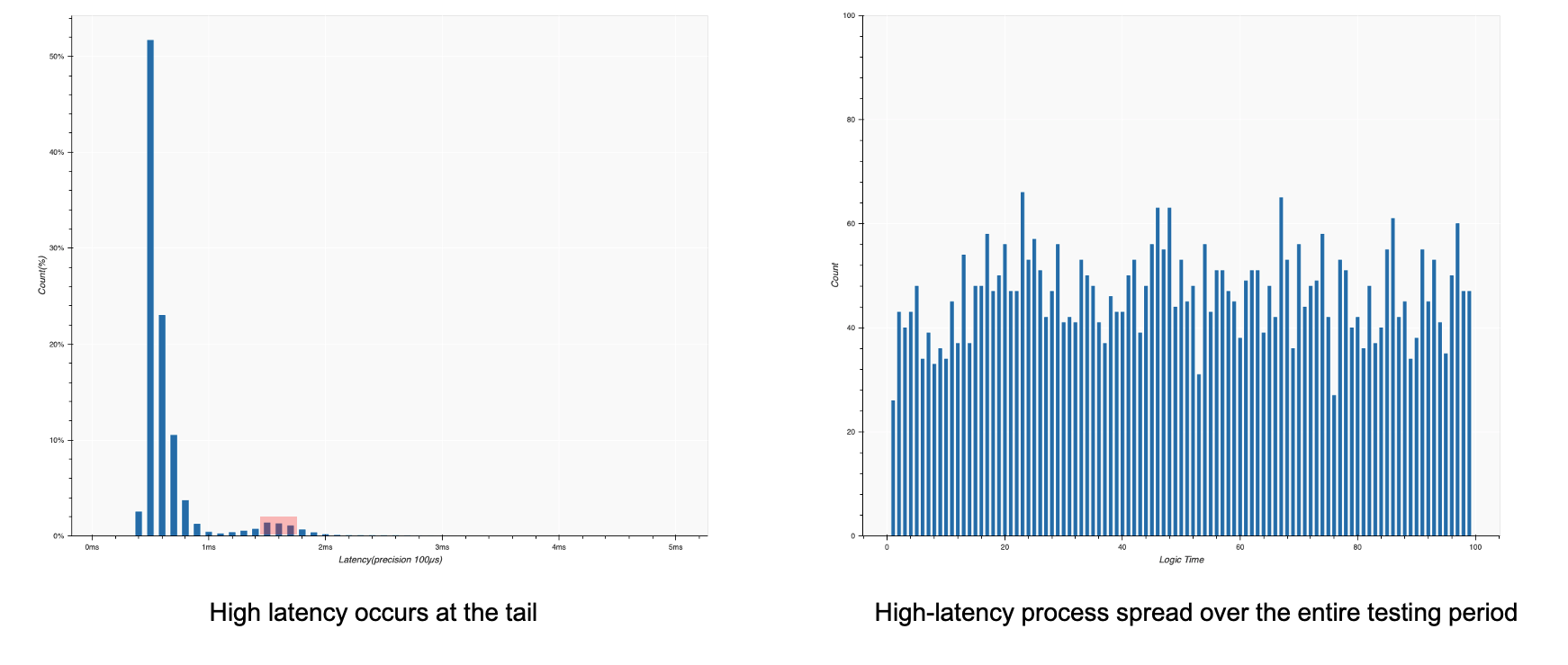 经过离线分析,我们发现了Envoy内消息处理延时的一些分布特征。左图是对Envoy处理延时与消息数量分布图,横轴是延时,纵轴是消息数量。可以看到在高延时部份,消息数量有异常增加的现象,这不是典型的幂率分布。进一步对高延时部份进行分析后发现,这些高延时消息均匀地分布于整个测试期间(如上图右所示)。 根据我们的经验,这通常是Envoy内部转发消息的worker在周期性的执行一些消耗CPU的任务,导致有一部分消息没办法及时转发而引起的。
