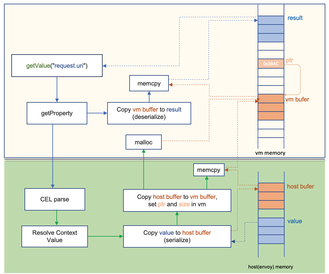 首先,Wasm扩展机制跟Envoy host环境是通过内存拷贝的方式进行通信,这是Wasm虚拟机的隔离性机制决定的。Envoy为了保持架构灵活性的同时保证性能,使设计了一个非Wasm虚拟机运行扩展(如stats extension)的模式,即NullVM模式,它是一个假的Wasm虚拟机,实际上运行的扩展还是被编译在Envoy内部,但它也逃离不掉Wasm架构带来的内存拷贝影响。