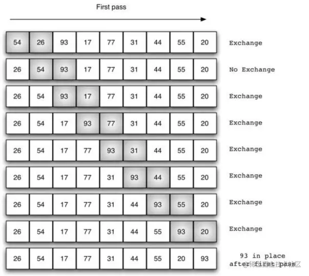 持续每次对越来越少的元素重复上面的步骤,直到没有任何一对数字需要比较