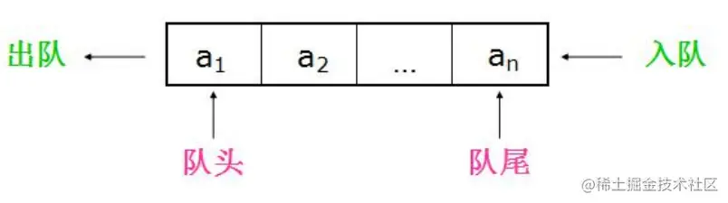 队列中没有元素时称为空队列。在空队列中依次加入元素 a1, a2, …, an 之后,a1 是队首元素,an 是队尾元素。显然退出队列的次序也只能是 a1, a2, …, an ,即队列的修改是依先进先出的原则进行的