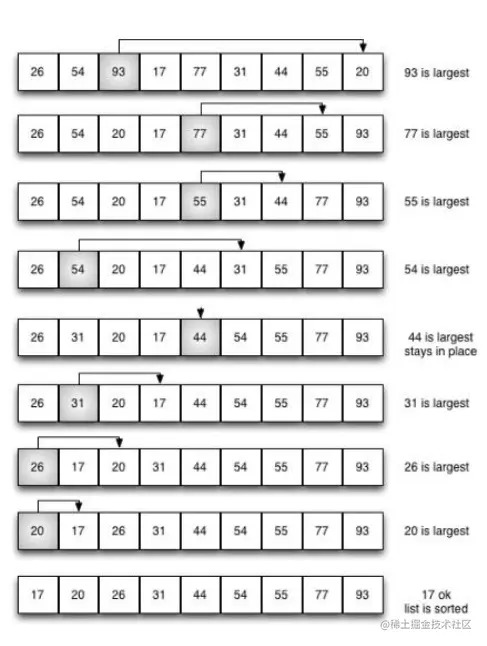 针对所有的元素重复以上的步骤,除了最后一个
