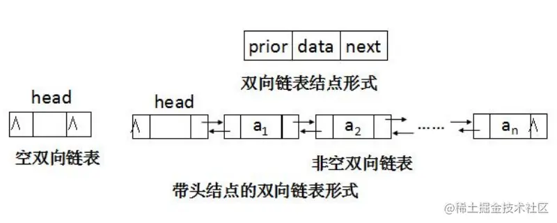 双向链表(Double Linked List) 指的是构成链表的每个结点中设立两个指针域,一 个指向其直接前趋的指针域 prior,一个指向其直接后继的指针域 next,这样形 成的链表中有两个方向不同的链,故称为双向链表
