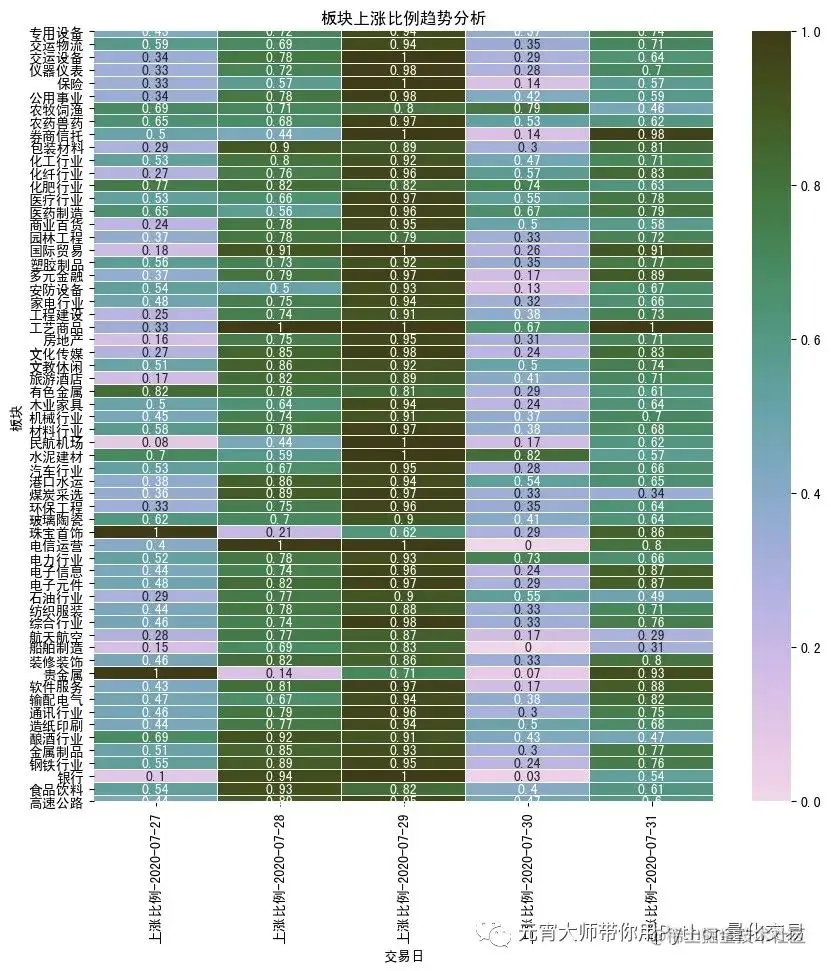 当然了,每天的板块数据是静态的,无法识别出板块的变化趋势,于是我们得把每天的板块数据链接起来分析。此处我们就先从近一个月的板块数据中选取2020-07-27至2020-07-31这一周的数据来进行分析。