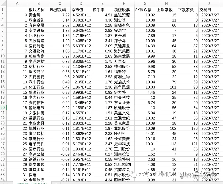 比如像我的话,会统计出每个交易日板块的一些整体动态,比如涨跌幅、总市值、换手率、上涨家数、下跌家数、领涨股票……如下所示为2020-07-27的板块情况: