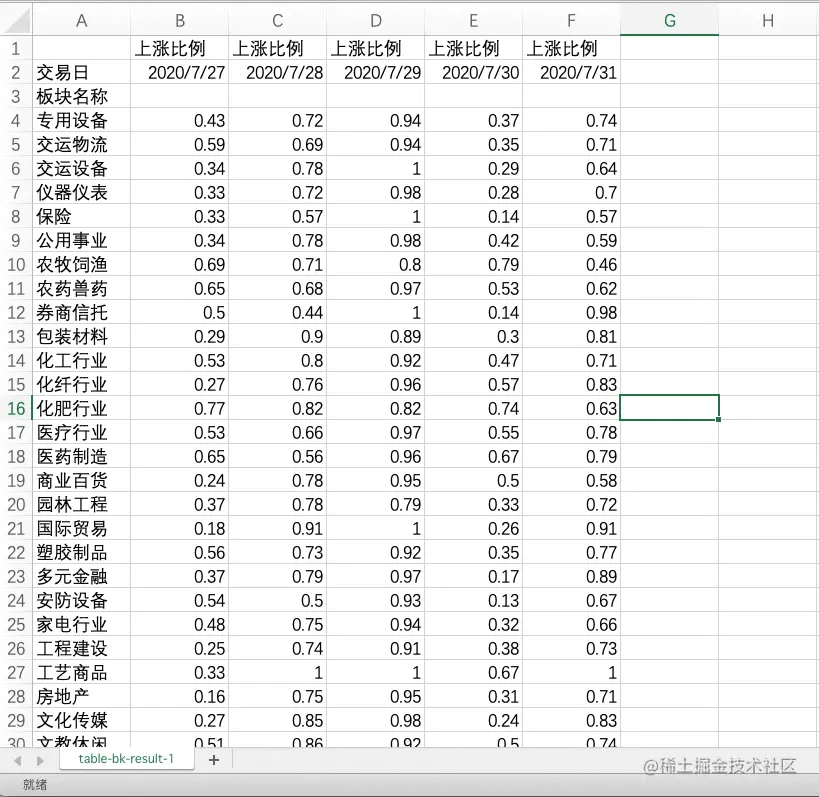 我们需要对数据做一些处理,计算出板块的上涨比例值,如下所示: