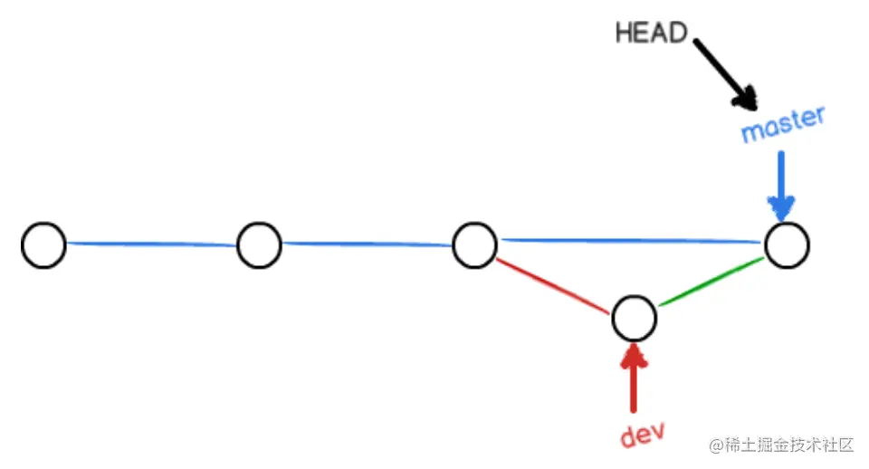 fast forward合并(如git merge dev)。合并后会删除分支dev,看不出来曾经做过合并 - 加上