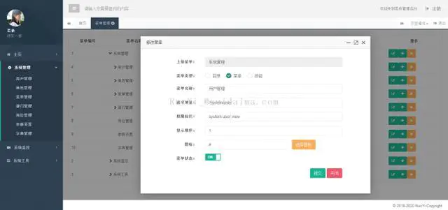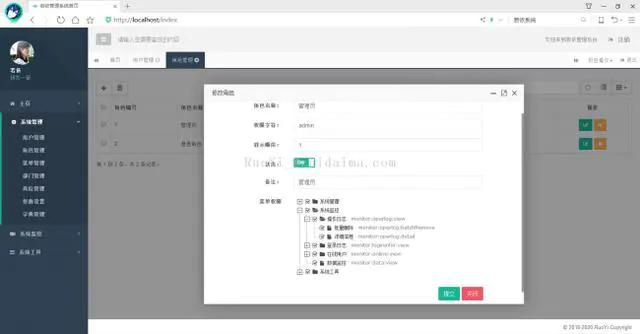4. 菜单管理:配置系统菜单(支持控制到按钮)。