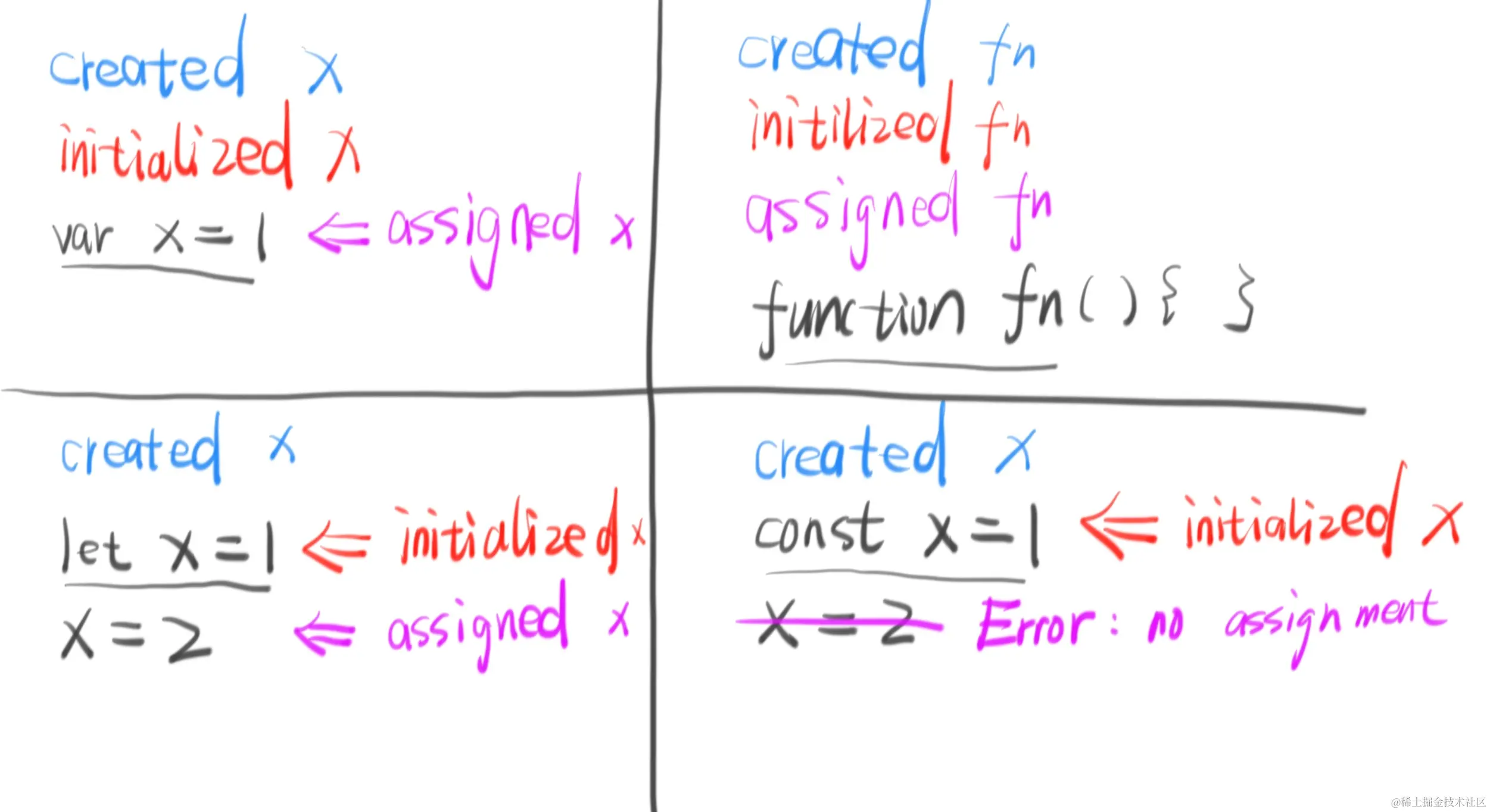 - const 和 let 只有一个区别,那就是 const 只有「创建」和「初始化」,没有「赋值」过程。