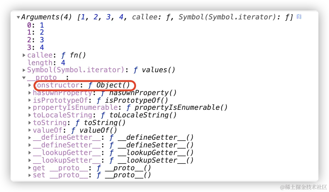 可以看到arguments的__proto__没有指向数组的prototype,而是直接到了Object这个根原型。