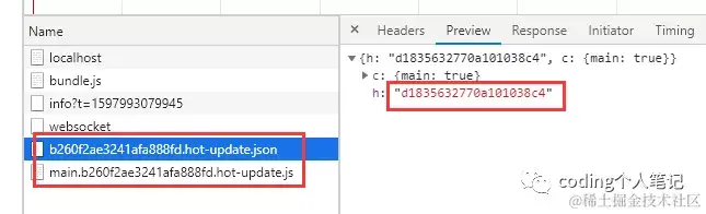 这边一笔带过内部机制,主要是我看不懂,也不理解,内部涉及HotModuleReplacementPlugin、HMR runtime等机制,怎么通过hash检查,怎么通过jsonp的方式,怎么把更新的模块代码传递给浏览器,这些底层原理还不是我能看懂的。可以通过源码,也可以看看network,每次热更新都会请求一个json文件和一个js: