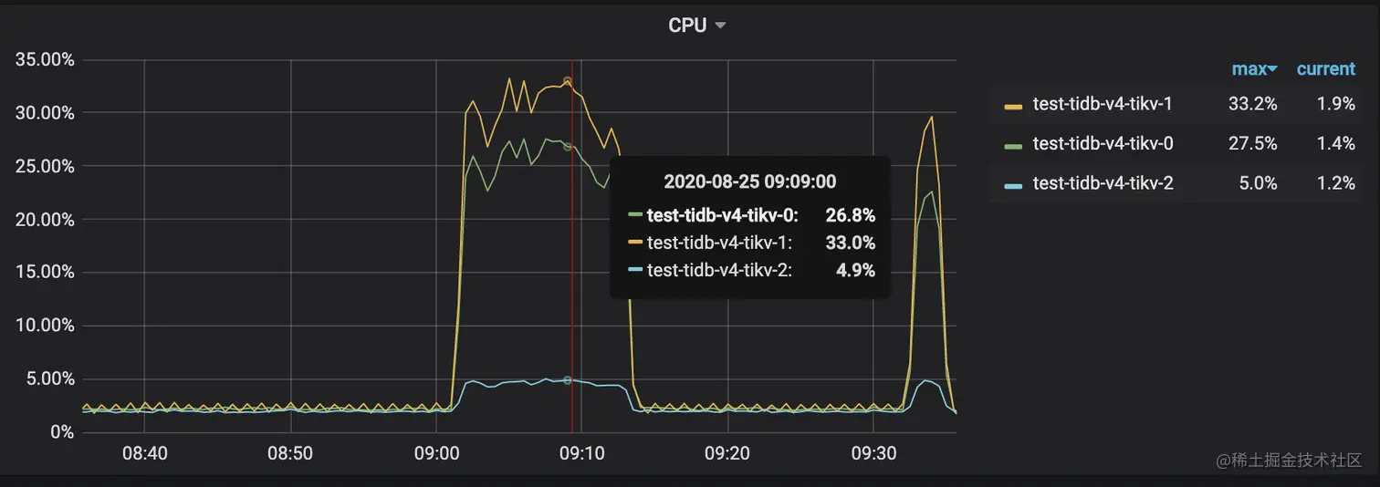 TiKV Details 面板中 Cluster 中各 server 的 CPU 以及 QPS 指标