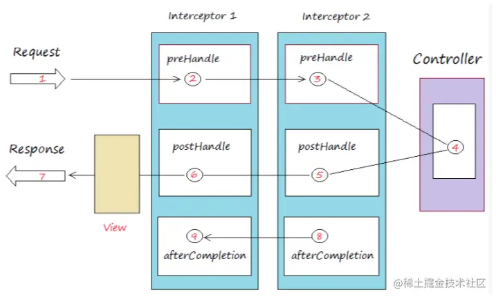 其基本思想就是允许应用程序在不修改逻辑的情况下,动态地实现一组可插拔的事件处理逻辑链。它能够在主业务操作的前后多个时间点上插入对应的“拦截”逻辑。下面这张图展示了 Spring MVC 拦截器的工作原理: