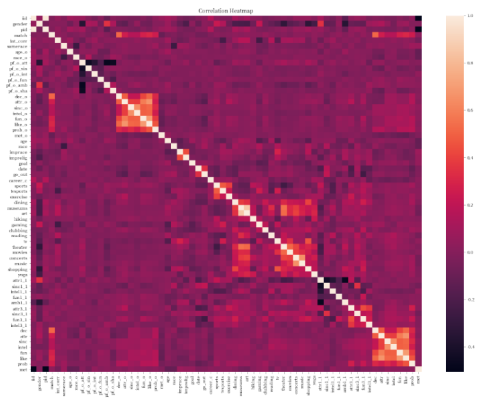 通过上面这张图这张相关性分析的热力图,我们可以先关注一些特别亮的和特别暗的点。比如我们可以发现,在 pf_o_att这个表示相亲对象给出的外观吸引力这个特征上,和其他相亲对象给出的评分基本都是严重负相关的,除了pf_o_fun这一特征。由此我们可以推断出两个点: