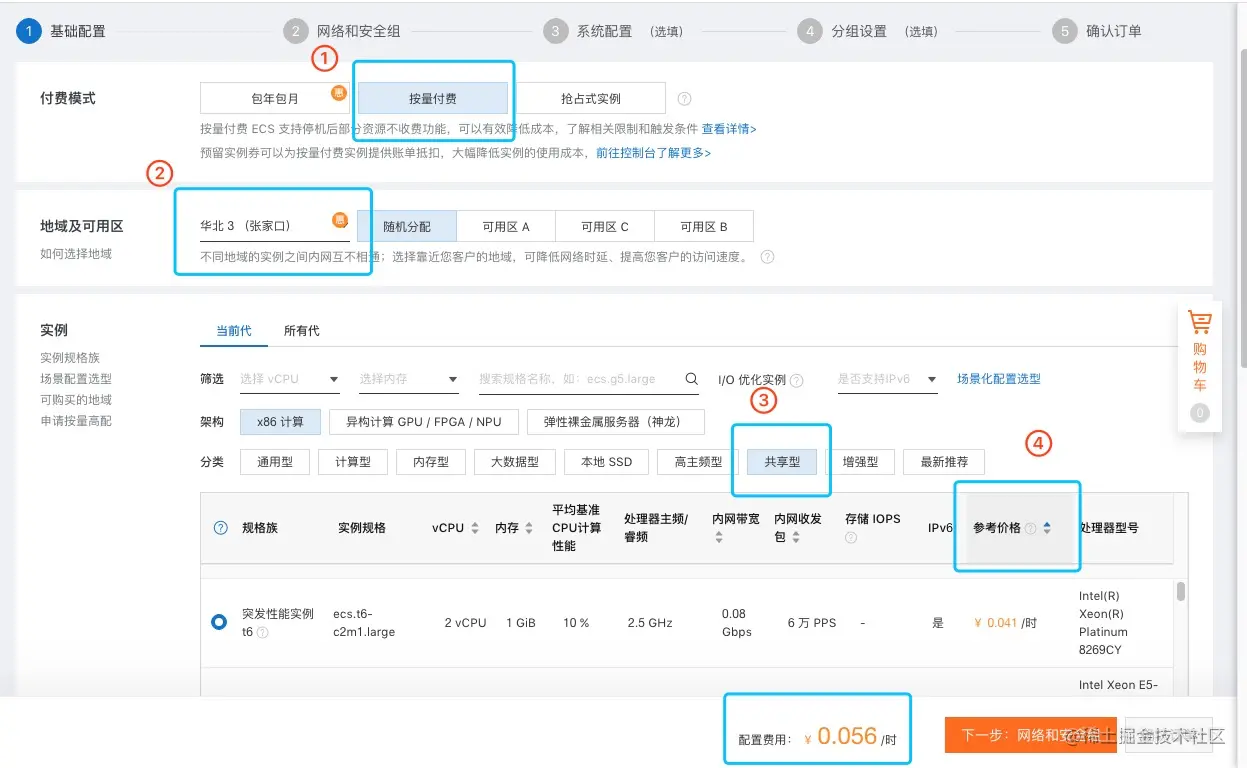 选择按量付费 - 共享型, 个人项目选最低配就行啦。不使用的时候关机,100 元就可以用很久。