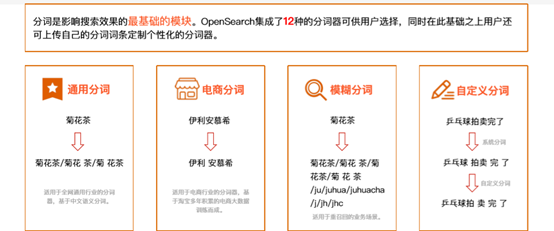 召回核心模块为分析器与查询分析。中文博大精深,易生歧义,分词效果至关重要。召回内置多种分析器,分析语言意图。查询分析提供同义词、纠错、词权重、实体识别、停用词分析等必备功能。 排序方面支持二次排序,是大数据量召回的有效解决方式。还支持类目预测、人气模型,支持表达式以及Cava排序定制。 根据业务需求需要支持混排、打散、词典管理等功能实现。混排指在搜索召回结果中根据业务需求相应展示视频、文字、图片等不同媒体类型结果。例如在淘宝搜索结果中,打散指品牌、价格等打散展示。 扩展即功能性扩展,如A/B Test、搜索框下拉提示、热搜&底纹(默认搜索词)、飘红、Debug工具等。 召回、排序、业务、扩展都是为了服务客户,使客户能以最小成本、最短时间交付高质量业务价值而提供的能力。 1.分析器 分析器是影响搜索效果的基础模块,不同业务场景需要使用不同分析器,需要用户结合自身业务场景自行选择。目前OpenSearch集成了12种分析器供用户选择,用户也可上传自己的分词词条个性化定制分析器。