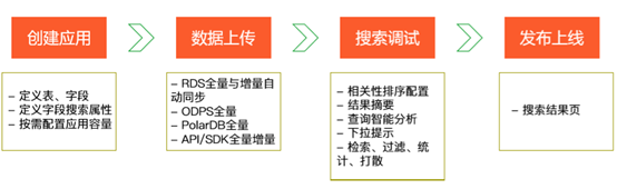 下图所示为搜索上线流程,创建应用、上传数据并进行简单调试后即可发布上线。若过程顺利半天即可完成。