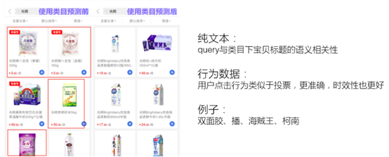 2.类目预测 用户搜索意图可分为精搜、泛搜,类目预测即预测用户搜索某一Query时目标类目的结果。类目预测并非依靠个人体感,而需要符合市场需求,根据行为数据尽可能快速满足用户需求。 如下图所示,使用类目预测前在淘宝搜索光明,可能出现米、面、奶等多种相关商品。而根据用户点击行为数据,100个用户搜索光明,绝大多数点击的商品是光明牛奶,意味着用户搜索光明通常是搜索光明牛奶,因此使用类目预测后前排推荐商品变化为光明牛奶。 类目预测也可使用纯文本方式。