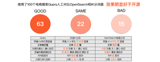 下图所示为阿里OpenSearch电商分析器与开源IK分析器对比数据,可见OpenSearch分析器的分词效果相对优于IK开源分析器。该对比随机抽取100个电商类Query,下图列举部分结果。例如925银耳饰,开源IK分析器分词有“银耳”一项,OpenSearch电商分词理解显然更优。