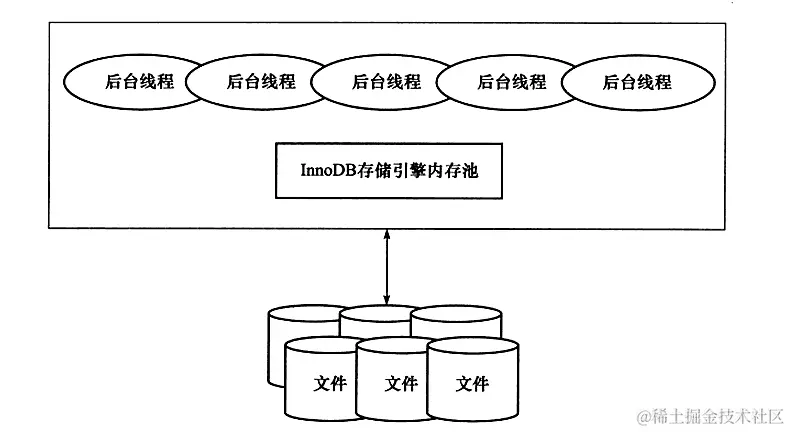 可以看到主要由3部分组成,分别为后台线程、InnoDB存储引擎内存池及文件。