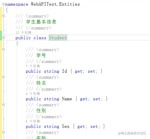 Student.cs中的相应字段和StudentController.cs中的接口添加描述信息,如下图所示: