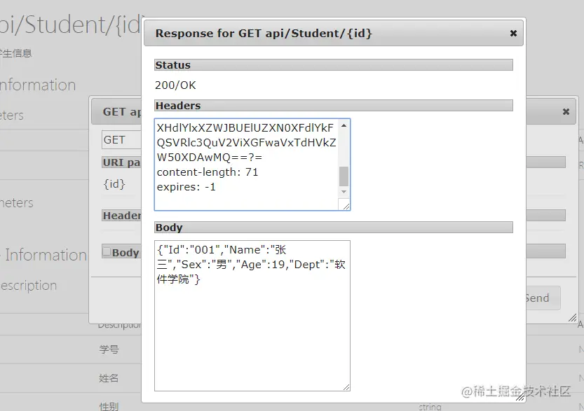 输出调用参数001,点击【Send】按钮,测试api/Student/{id},调用结果如下图所示: