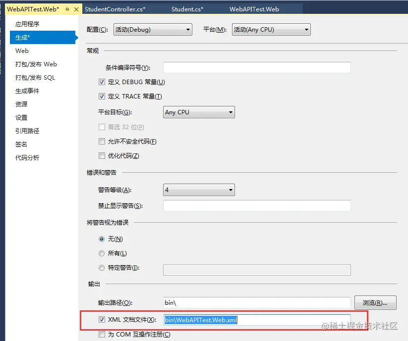 分别勾选WebAPITest.Entities和WebAPITest.Web项目【属性-生成-输出-XML文档文件】,如下图所示: