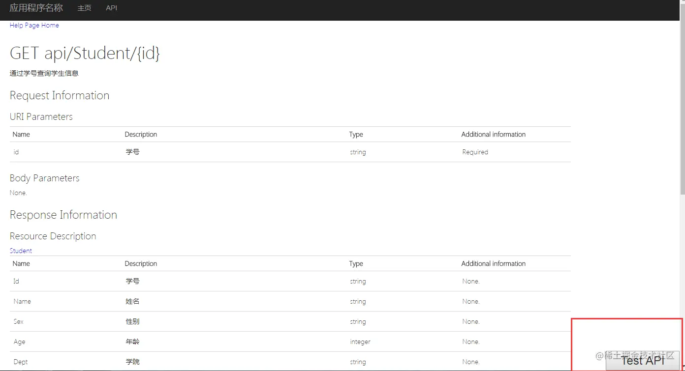 添加完成后,运行程序,调用api/Student/{id},此时发现在页面右下角出现一个【Test API】按钮,如下图所示: