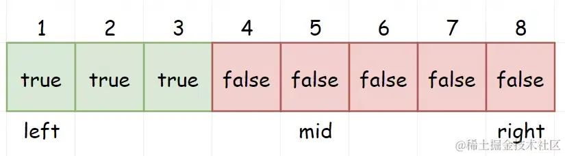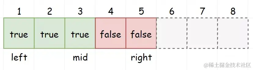 如果中间的mid如果是错误版本,那我们就知道 mid 右侧都不可能是第一个错误的版本。那我们就令 right = mid,把下一次搜索空间变成[left, mid],然后自然我们很顺利查找到目标。