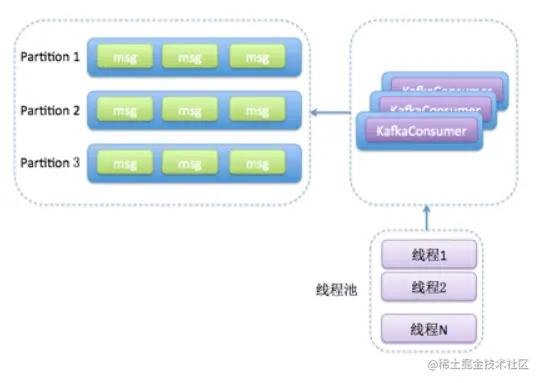 - 消费者程序使用单或多线程获取消息,同时创建多个消费线程执行消息处理逻辑。获取消息的线程可以是一个,也可以是多个,每个线程维护专属的 KafkaConsumer 实例,处理消息则交由特定的线程池来做,从而实现消息获取与消息处理的真正解耦。具体架构如下图所示: