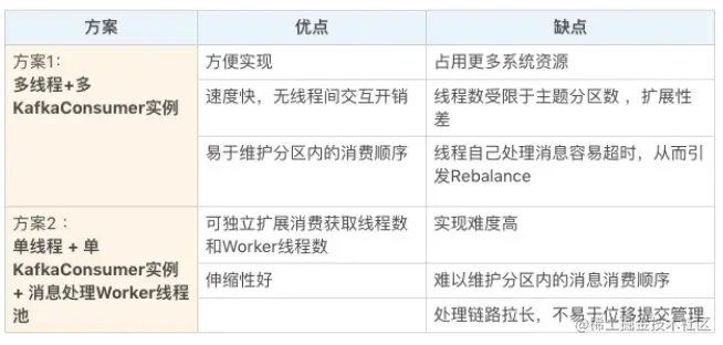 - 因为该方案将消息获取和消息处理分开了,也就是说获取某条消息的线程不是处理该消息的线程,因此无法保证分区内的消费顺序。举个例子,比如在某个分区中,消息 1 在消息 2 之前被保存,那么 Consumer 获取消息的顺序必然是消息 1 在前,消息 2 在后,但是,后面的 Worker 线程却有可能先处理消息 2,再处理消息 1,这就破坏了消息在分区中的顺序。还是那句话,如果你在意 Kafka 中消息的先后顺序,方案 2 的这个劣势是致命的。