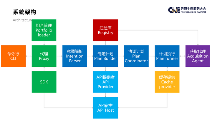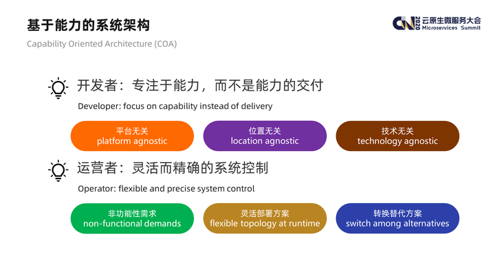 我们从另外一个角度看——运营方面,运营也会有更灵活和更精确的控制。比如你随便选择了一家数据库公司,然后用这个公司的 SDK 来进行开发,结果公司倒闭了,这就是个问题。而 COA 允许你在选择能力供应商时,同时考虑功能性和非功能性的需求。而作为运维,您可以独立评估选择供应商,然后根据不同的部署场景,选择不同的能力供应商。它可能是本地的,也可能是远程的,甚至是人工的,这都不影响程序的架构和代码,同时您也可以灵活选择部署方案。另外您可以用创新性的替代方案来取代原来的方案,回到人工智能问题,大概在一年前,谷歌的 BERT 还很厉害,但现在微软的 GPT-3展现出了无与伦比的能力,有了 COA 您就可以在运营过程中对这个模型进行选择,甚至综合多方的结果提供一个更佳的方案,这些都是一个运维的问题,而不是开发的问题。