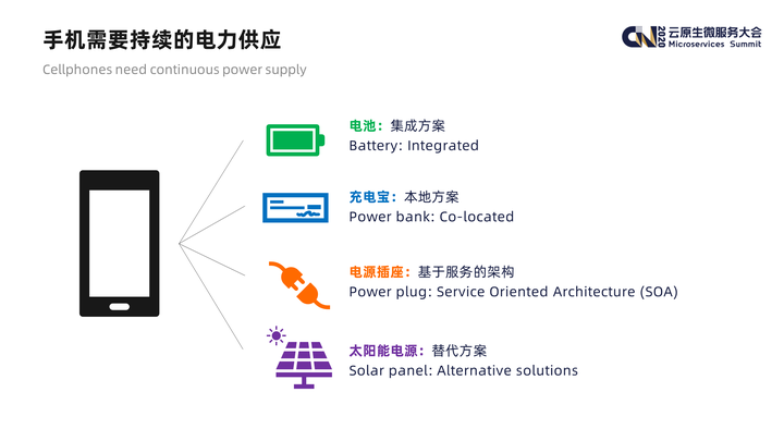 这个例子说明什么呢?它说明对于系统所需的关键能力,比如获得持续电力的能力,我们经常需要多个替代方案来确保能力的存在。比如您的手机没电了,你会在乎你的电源插头插在哪里吗?你会在乎充电宝的形状和颜色吗?这些都不是关键。你需要的就是供电的能力,至于这个能力是不是基于服务的架构,以及这个能力是如何提供的,这都不那么关键。