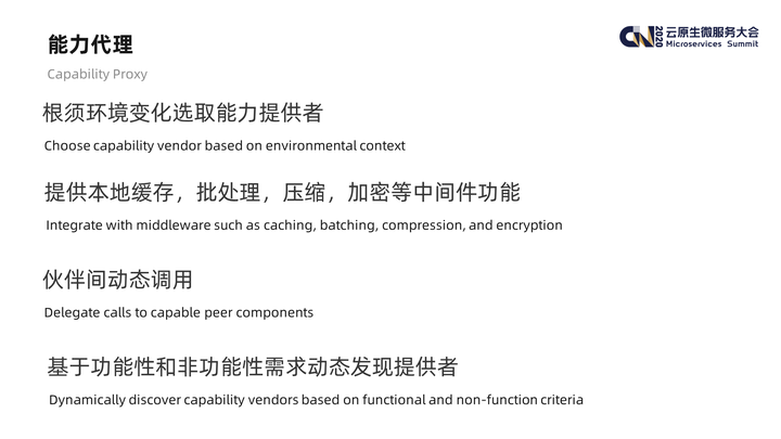 第四,基于功能性和非功能性需求动态发现提供者。能力代理的发现功能和我们普通所说的服务发现的过程不太一样。因为在发现能力的过程中,我们可以同时考虑功能性和非功能性的需求。比如在发现一个能力供应商的时候,我们不但要考虑系统的性能、表现,甚至供应商本身的资质也是我们考虑的要素。