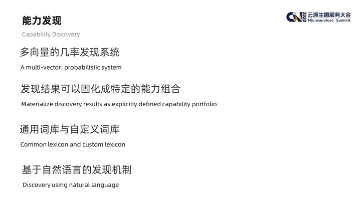而能力发现模式是由用户来提交他所要实现能力的意图,然后系统根据意图进行语义上的发现,通过发现的过程可以真正发现一个可以进行相加计算的服务。然后我们可以把非功能性的因素也考虑进来,比如它的 SLA、安全性、供应商资质等,所以能力发现实际上是一个比较复杂的系统。