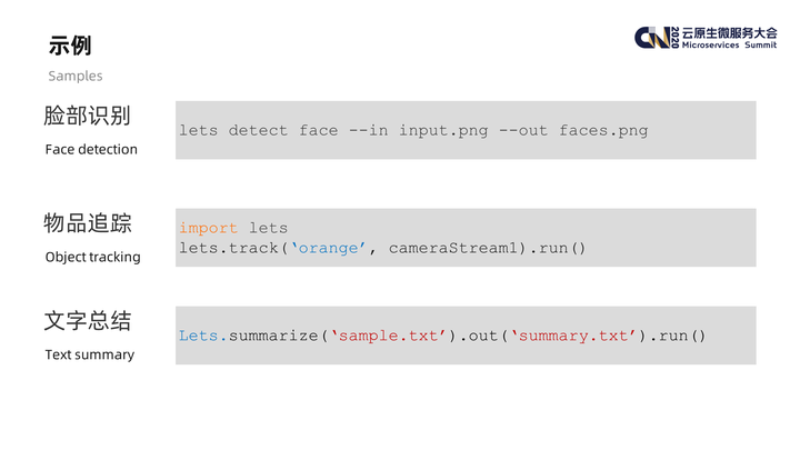 这就是我们设想的 lets 系统在使用时在开发者上的体验。大家可以看到,我们把 AI 的能力完全封装在 proxy 的后面,对于开发者来说, AI 的能力到底是远程的服务,还是本地的容器,还是本地的 SDK,这些都不重要。你所需要的就是描述你程序所要实现的功能,然后通过 COA 的 proxy 把这些功能呈现给你的程序。作为运维来说,它可以根据具体的部署场景来选择功能具体的交付方式。