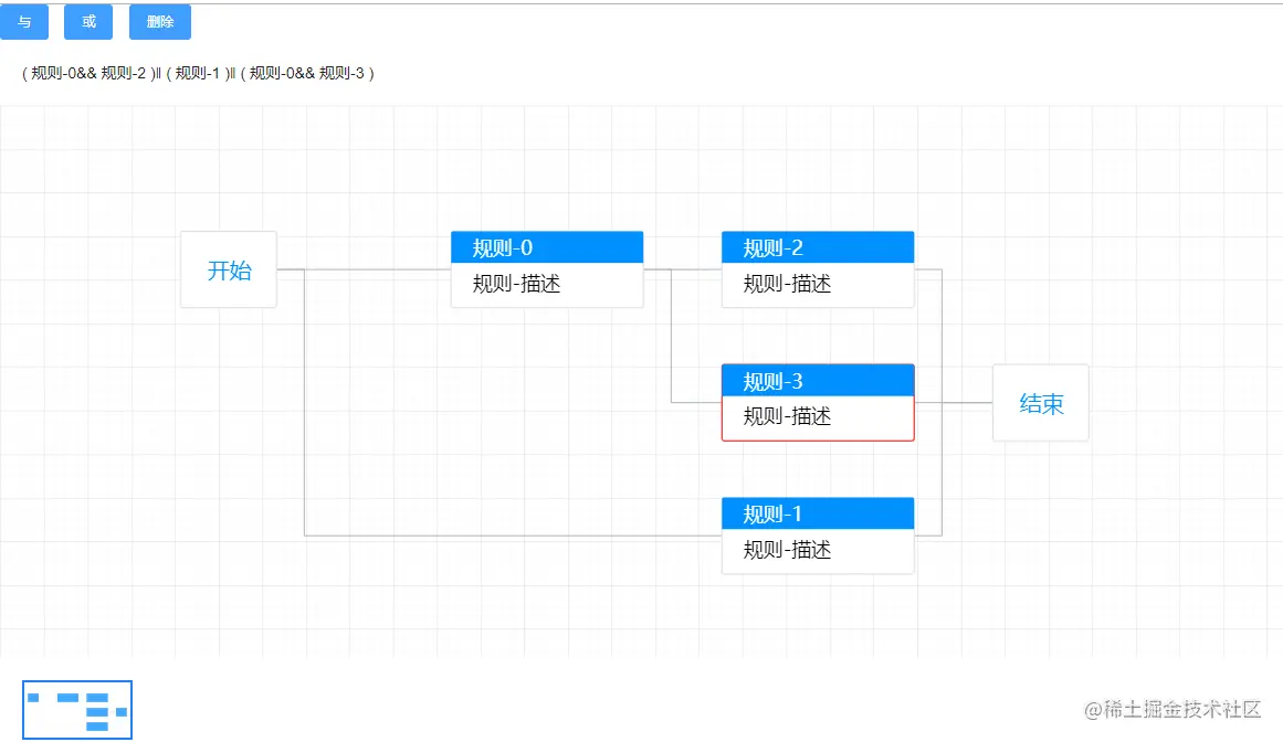 所有的流程共用开始至结束,每添加一个节点则生成一条“规则”,节点之间存在与或以及删除的操作逻辑。(实际业务场景存在‘非’逻辑,只需加上标识即可)