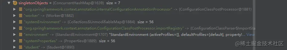 - 当前方法结束后beanFactory中的一些重要属性 singletonObjects这个Map就是我们通常说的spring单例池,用来存放bean。