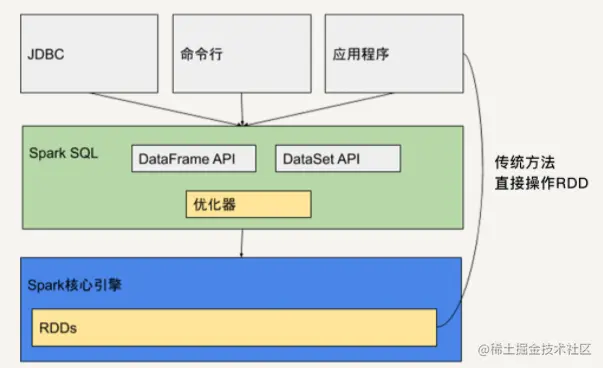 如上图所示,它提供类似于 SQL 的操作接口,允许数据仓库应用程序直接获取数据,允许使用者通过命令行操作来交互地查询数据,还提供两个 API:DataFrame API 和 DataSet API。