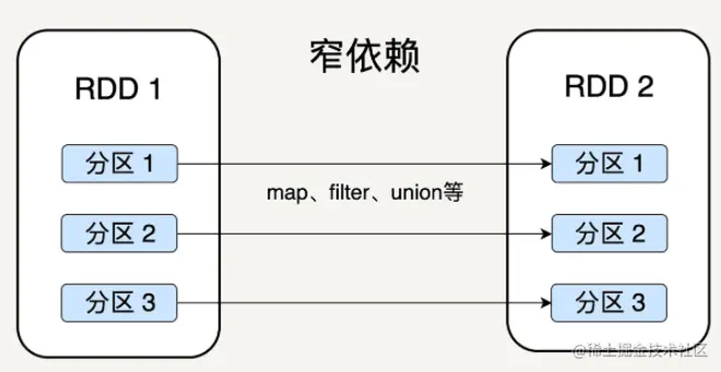 窄依赖就是父 RDD 的分区可以一一对应到子 RDD 的分区,宽依赖就是父 RDD 的每个分区可以被多个子 RDD 的分区使用。