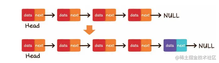 尾部插入,把最后一个节点的next指针指向新插入的节点即可。