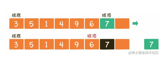 入栈操作(push)就是把新元素放入栈中,只允许从栈顶一侧放入元素,新元素的位置将会成为新的栈顶这里以数组为例。