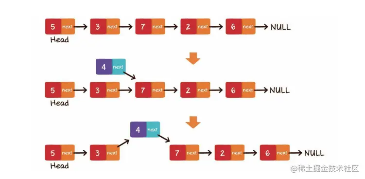 中间插入,同样分为两个步骤。 第1步,新节点的next指针,指向插入位置的节点。第2步,插入位置前置节点的next指针,指向新节点。